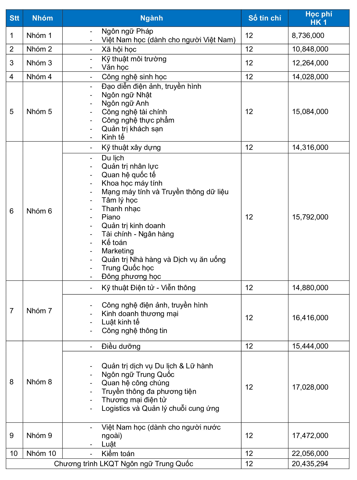 - Học phí mỗi học kỳ được tính theo số lượng tín chỉ sinh viên đăng ký