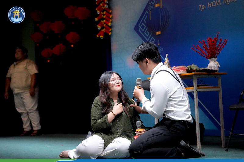 Một phân cảnh trong Vở kịch "Về nhà ăn Tết" được biểu diễn bởi các bạn sinh viên Khoa Xã hội - Truyền thông
