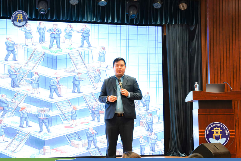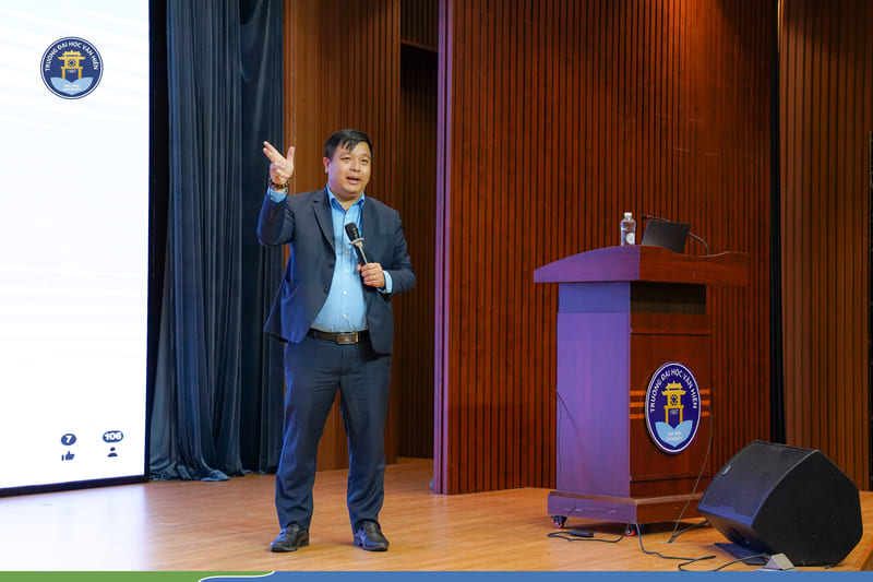 Diễn giả trong phần chia sẻ với các bạn sinh viên Văn Hiến