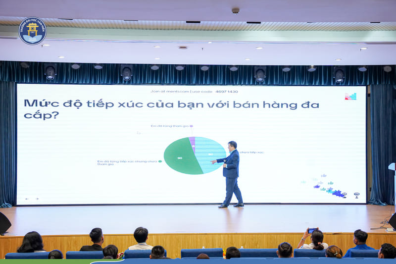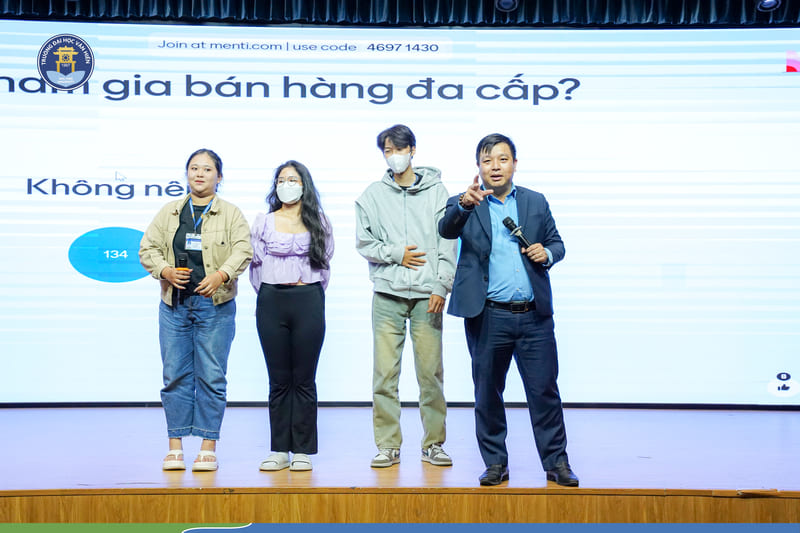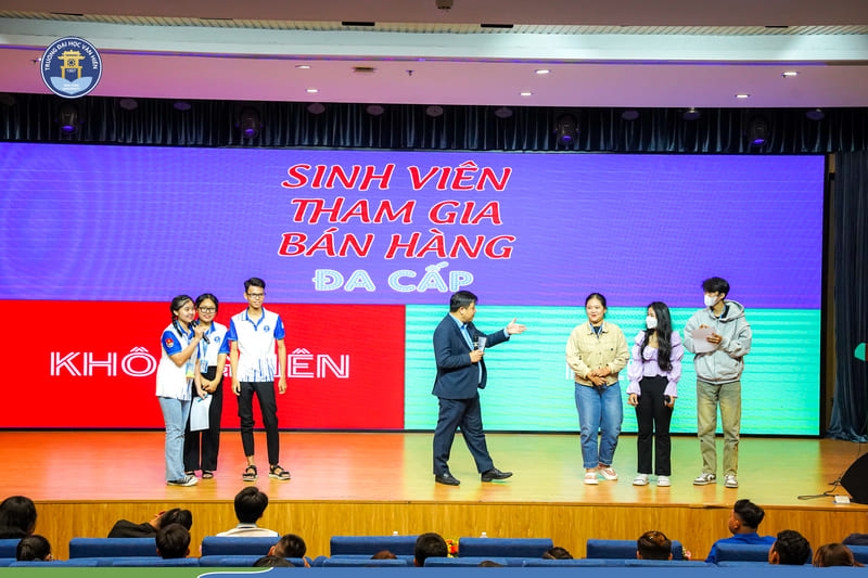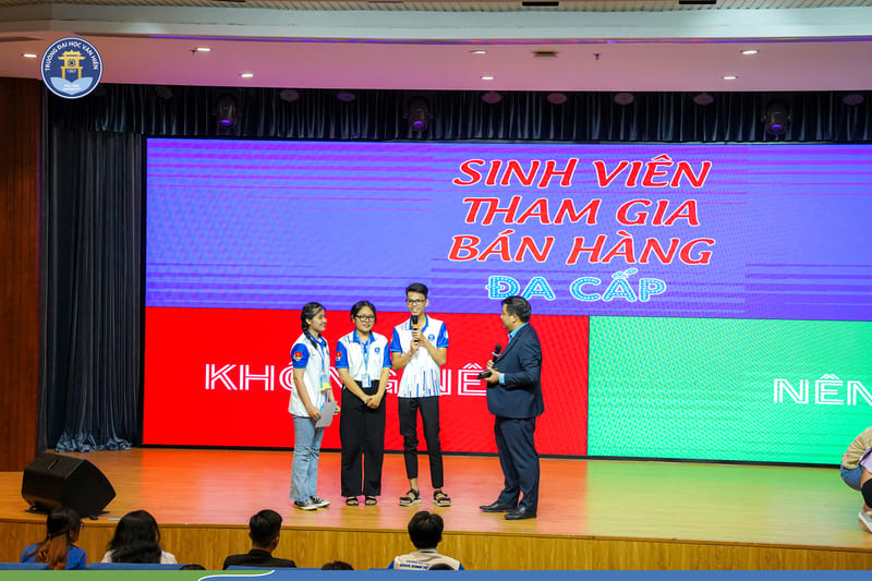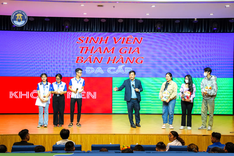 Diễn giả cũng đã thông tin đến các bạn sinh viên về quy định “Bán hàng đa cấp chỉ áp dụng đối với hàng hóa, không áp dụng đối với các loại hình kinh doanh dịch vụ khác”. Hàng hóa không được bán theo phương thức đa cấp: thuốc, trang thiết bị y tế, các loại thuốc thú y, hóa chất,... và sản phẩm nội dung số, sản phẩm công nghệ.
