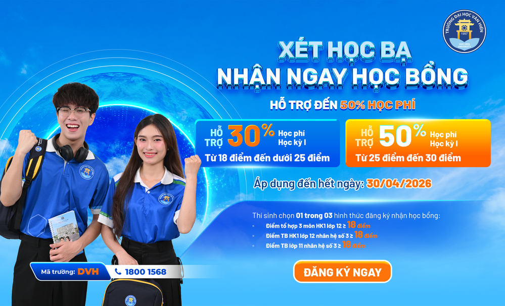 Xét học bạ vào Đại học Văn Hiến 2026 nhận ngay "Học bổng Đồng hành" lên đến 50% học phí HK1. Điều kiện linh hoạt chỉ từ 18 điểm. Đăng ký trước 30/04/2026!