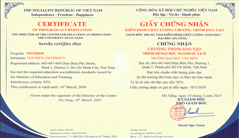 Chứng nhận này tạo cơ sở quan trọng cho sự phát triển và nâng cao chất lượng đào tạo trình độ cử nhân ngành Du lịch tại Trường Đại học Văn Hiến. Đây là minh chứng cho những nỗ lực của Nhà trường trong việc đáp ứng các tiêu chuẩn kiểm định, đảm bảo chất lượng giáo dục và đào tạo nguồn nhân lực có trình độ cao.