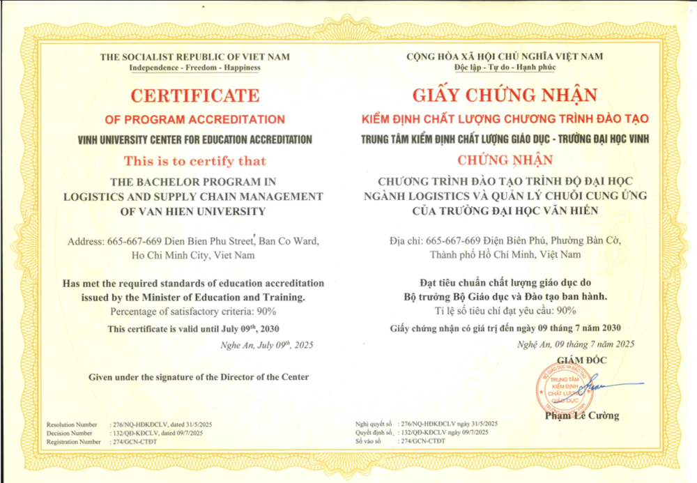 Ngày 09/7/2025, Trường Đại học Văn Hiến đạt chứng nhận kiểm định chất lượng chương trình đào tạo trình độ đại học ngành Logistics và Quản lý chuỗi cung ứng.