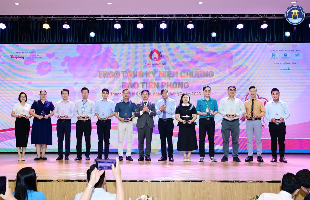 Đặc biệt, Báo Tiền Phong - đơn vị khởi xướng chương trình - đã trao tặng Kỷ niệm chương như một lời cảm ơn trân trọng nhất gửi đến những cá nhân không chỉ tích cực trực tiếp hiến máu mà còn có nhiều đóng góp thiết thực trong chuỗi hoạt động của Chủ nhật Đỏ 2026. Những phần thưởng cao quý này chính là kết quả xứng đáng cho một hành trình nỗ lực không ngừng nghỉ vì cộng đồng của đại gia đình Văn Hiến.