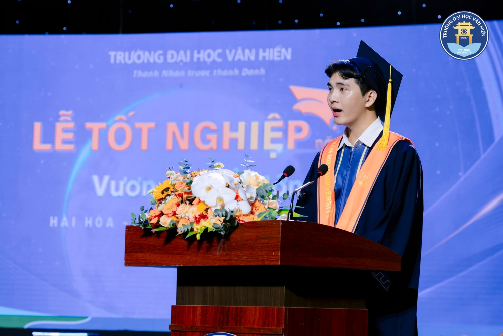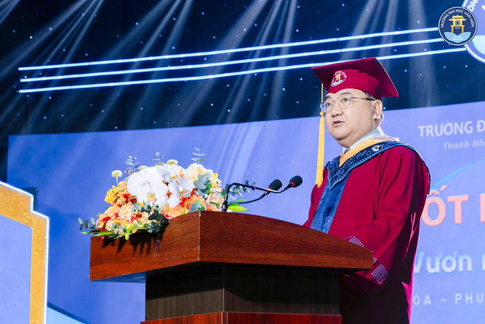 Phát biểu tại buổi lễ, PGS. TS Nguyễn Minh Đức - Hiệu trưởng Nhà trường gửi lời chúc mừng đến các tân khoa và bày tỏ niềm tự hào trước những nổ lực không ngừng của sinh viên trong suốt hành trình học tập. Thầy Đức chia sẻ: “Những năm tháng các bạn học tập tại Trường Đại học Văn Hiến không chỉ là quá trình tích lũy kiến thức mà còn là thời gian để các em phát triển bản thân, rèn luyện các kỹ năng cần thiết và tìm kiếm giá trị của mình. Những gì mà các bạn đã học được với sự tận tâm truyền đạt kiến thức của quý Thầy Cô giáo sẽ là nền tảng vững chắc, là hành trang quý báu giúp các bạn vượt qua mọi sóng gió để tự tin và sẵn sàng đón nhận những thử thách mới. Các bạn sẽ không thể đạt được những thành công lớn nếu chỉ dựa vào những gì học được trong sách vở. Các bạn cần phải học cách vận dụng kiến thức vào thực tiễn, phải học cách làm việc với những đồng nghiệp và phải có khả năng nhìn nhận, phân tích và tự tin giải quyết vấn đề một cách sáng tạo và hiệu quả”.