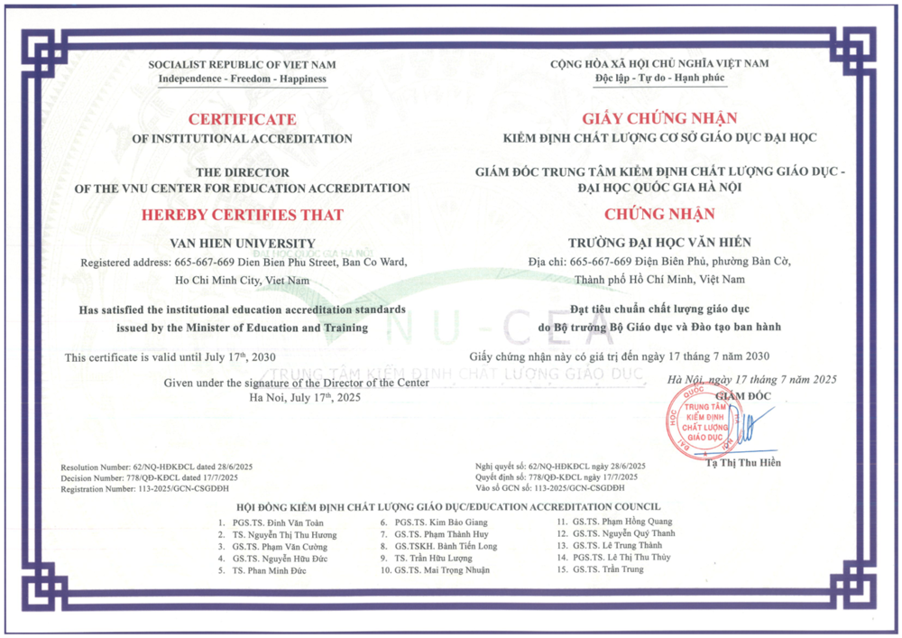 Ngày 17/7/2025, Trường Đại học Văn Hiến chính thức được cấp chứng nhận kiểm định chất lượng cơ sở giáo dục theo Quyết định số 778/QĐ-KĐCL. Đây là kết quả của chu kỳ kiểm định lần thứ hai, tiếp nối thành tựu từ lần kiểm định đầu tiên vào ngày 12/3/2020, khi Nhà trường đã được công nhận đạt chuẩn chất lượng cơ sở giáo dục.