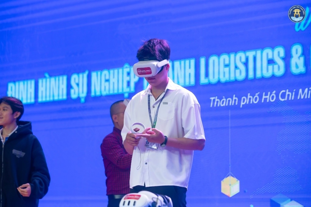 Điểm nhấn khác biệt của Workshop là hoạt động trải nghiệm không gian Logistics ảo bằng kính 3D (VR). Thay vì chỉ nghe lý thuyết, sinh viên VHU đã trực tiếp quan sát môi trường làm việc hiện đại, quy trình vận hành kho bãi thông minh trong không gian đa chiều. Trải nghiệm này giúp các bạn nâng cao nhận thức về vai trò của công nghệ và những yêu cầu khắt khe về năng lực số đối với nguồn nhân lực tương lai.